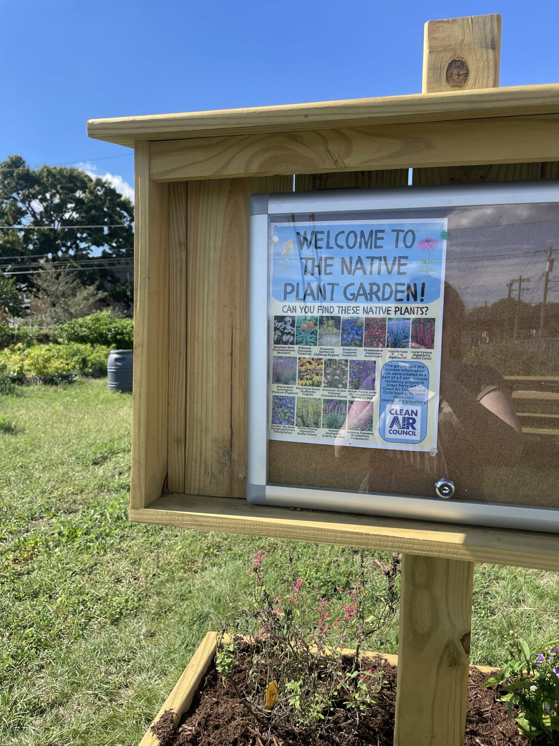 In addition to the pollinator garden and seating areas, Council staff worked with Philly Thrive’s Mutual Aid circle and the Tasker-Morris Neighborhood Association to create a climate guide of the Grays Ferry neighborhood that shows pollution sources as well neighborhood resources. The guide is featured in a custom made climate information station in the garden, which features a planter box as well as a space to distribute community flyers and pamphlets.