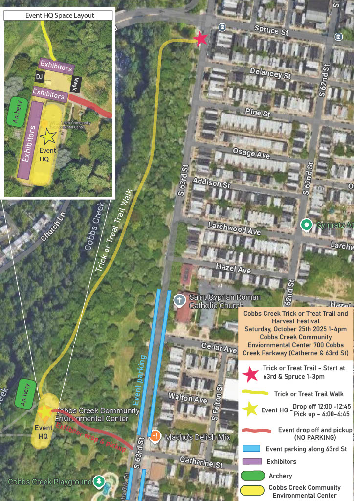Starting at 1pm, trick-or-treaters will meet at Spruce Street and Cobbs Creek Parkway to make their way down the wooded natural surface trail to the Environmental Center. (Costumes are encouraged but not required!) Also from 1-3 p.m., children can enjoy face paint, balloon animals, a magician, and arts and crafts, or try their hand at archery starting at 2 p.m. Festival attendees can also expect to connect with new community resources and learning opportunities, including bird walks and nature education. We’d love to see you there!