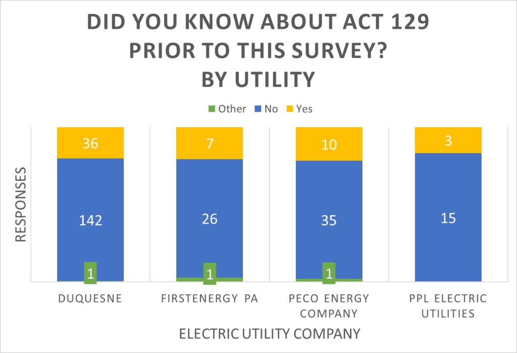 Unsurprisingly, 79% of respondents were not aware of their utility’s Act 129 program. Among those familiar with this program, people said they learned about Act 129 through their own research, media coverage of Act 129, working in a relevant field, and mailers from their utility.