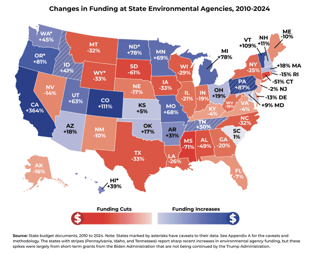 - Nationally, seven of the 10 states with the largest percent cuts to their environmental agencies from 2010 to 2024 had Republican governors in a majority of these 15 years, while only three had mostly Democratic governors.