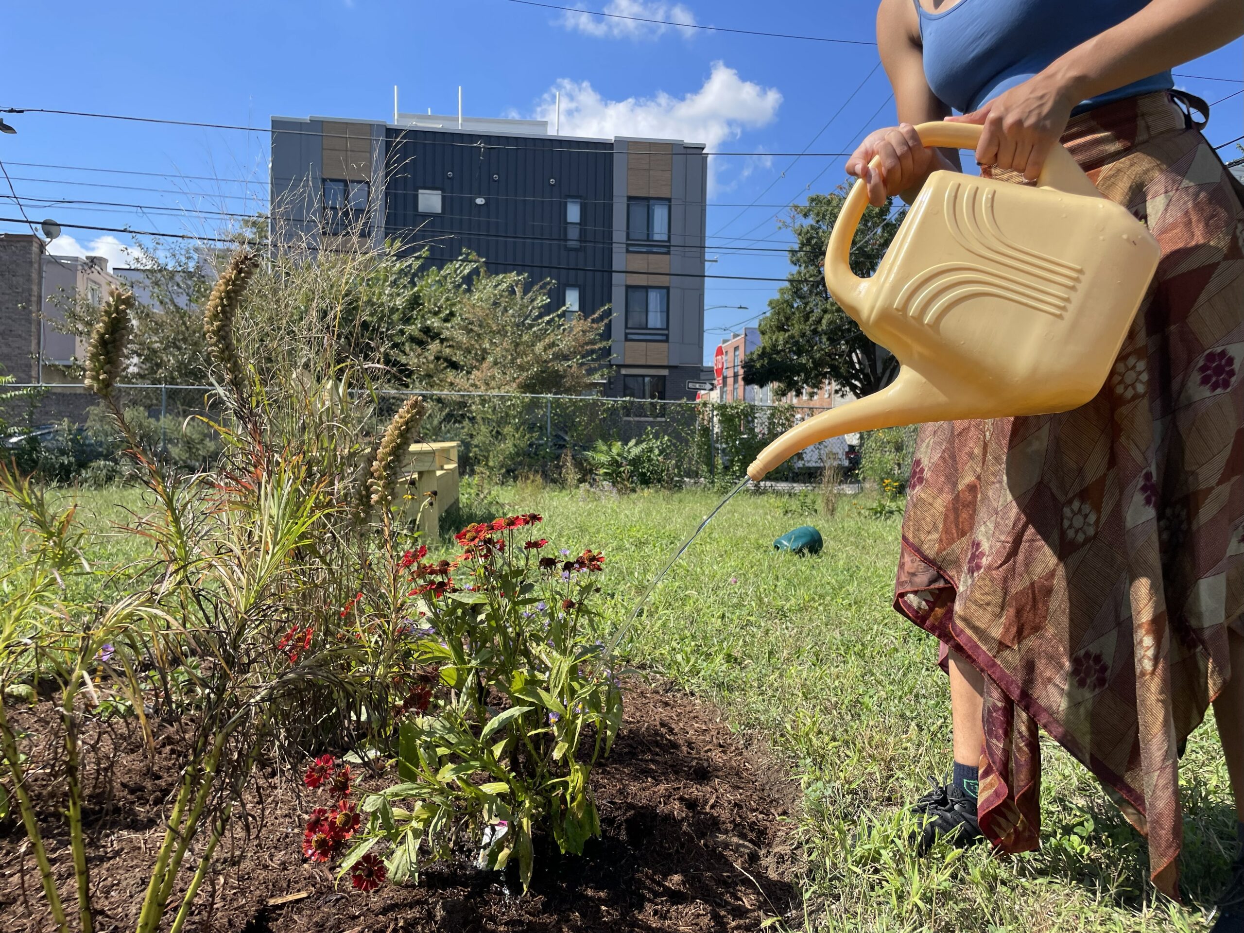 In South Philadelphia, the Council worked with the Church of the Redeemer Baptist’s Growing Together Community Garden to expand the existing native pollinator garden and create a gathering space for gardeners of the site’s over 200 plots. This included the installation of new picnic tables with shade umbrellas as well as several park benches. The creation of a community gathering space in the garden will support residents to further develop this local greenspace, which helps to cool the neighborhood and build community cohesion.